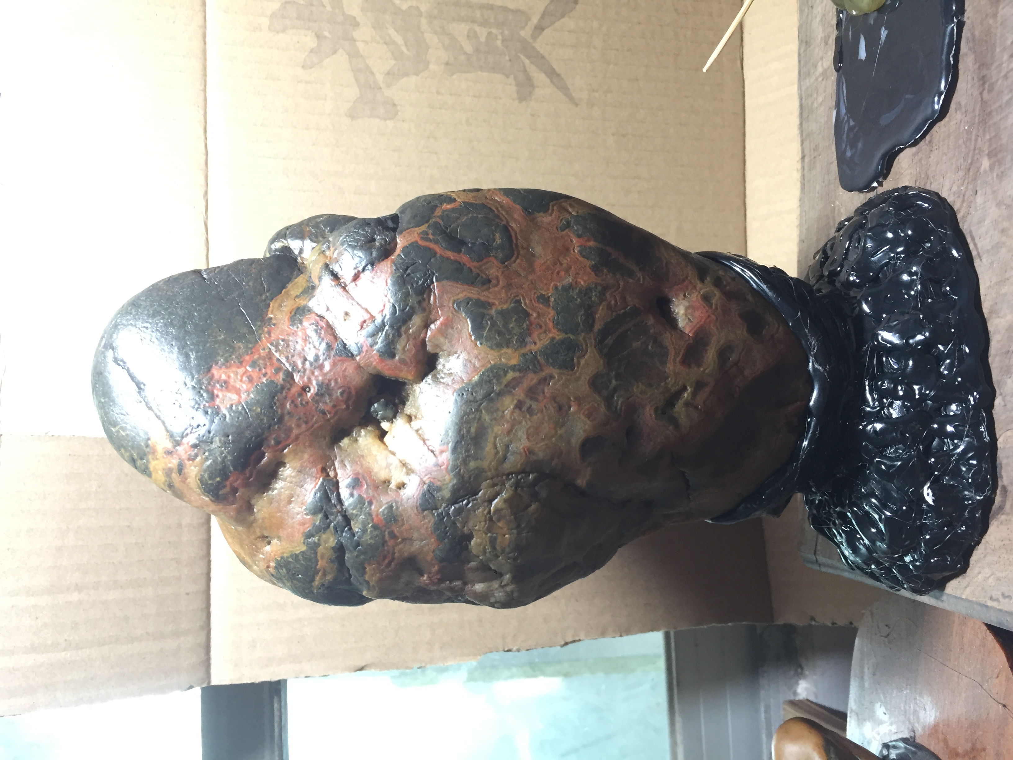 壮锦石产于广西百色地区右江流域。底座是我自己用棒胶做的,经济又简单。收藏奇石好处多多,受益匪浅,欢迎喜爱奇石的朋友一起交流。