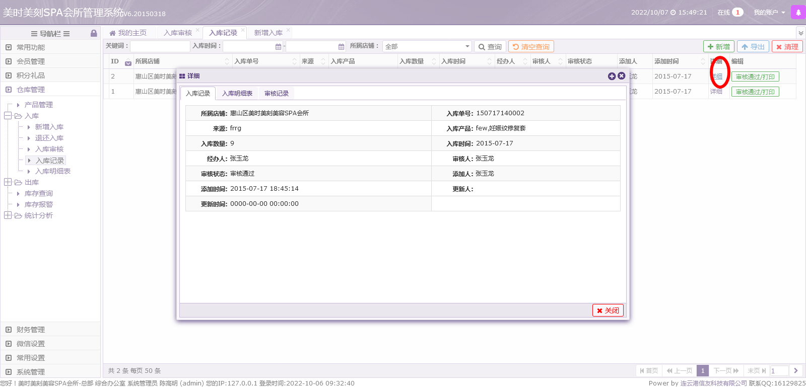 美时美刻SPA会所管理系统7大模块介绍- 第三模块-仓库管理 - 入库记录管理