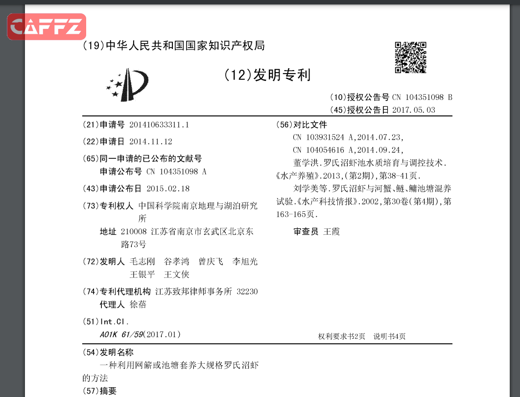 Abstract 本发明涉及一种利用网簖或池塘进行大规格罗氏沼虾和河蟹同池养殖的方法,避免了传统养殖方法中高密度的罗氏沼虾苗种对幼蟹生长和成活率的影响,并减少了饲料的投喂量与管理成本,明显提高了养殖水体的单位经济效益。若推广应用本方法,可大大提高河蟹、罗氏沼虾养殖户或养殖公司的经济效益。 Classifications Description 一种利用网簖或池塘套养大规格罗氏沼虾的方法 技术领域 本发明涉及水产养殖领域,尤其涉及一种罗氏沼虾的套养方法。 背景技术 目前,由于河蟹和罗氏沼虾国内外市场需求旺盛,国内已掀起了河蟹和罗氏沼虾养殖热潮,许多水产养殖大省也纷纷立项对河蟹和罗氏沼虾的苗种繁育及养殖技术进行研究与优化,以期推动本省河蟹和罗氏沼虾的养殖业快速发展。 已有研究表明,养殖网簖或池塘中河蟹主养,罗氏沼虾套养,并辅以鲢鳙调节水质的养殖模式已较为成熟。但这些模式下的罗氏沼虾套养主要以早期小规格(3~4 cm/尾)的虾苗投放为主,未见大规格(8~10 g/尾)罗氏沼虾投入蟹池进行同池暂养的报道。以往养殖模式的主要不足之处在于高密度小规格罗氏沼虾的早期投放会与幼蟹展开竞争食物,影响幼蟹的生长和成活率,并且需要部分特定饵料的投放与人工管理,未能实现经济效益最大化。而大规格罗氏沼虾投入蟹池进行同池暂养,有效避免了以上问题,且其养殖成品规格大(80~100 g/尾)、经济附加值高,能明显提高养殖户或养殖公司的经济效益。 目前国内将低密度大规格罗氏沼虾在河蟹网簖或池塘中进行同池养殖还没有先例。发明内容 本发明的第一目的在于提出一种利用网簖或池塘进行大规格罗氏沼虾和河蟹同池养殖的方法,避免了高密度的罗氏沼虾苗种对幼蟹生长和成活率的影响,并减少了饲料的投喂量与管理成本,明显提高了养殖水体的单位经济效益。若推广应用本方法,可大大提高河蟹、罗氏沼虾养殖户或养殖公司的经济效益。 为实现上述目的,本发明采用如下技术方案: 一种利用网簖或池塘套养大规格罗氏沼虾的方法,包括以下步骤: (1)养殖场地设置 用于养殖的网簖或池塘设计面积不低于10亩,水深1~2 m,底部淤泥厚度为15~25cm,底质平坦;所述网簖养殖场地采用网片围隔,网片下端埋入底泥中0.6±0.1 m,网簖上端需向内悬挂塑料片以防河蟹外逃,网片围隔外再以绢布(优选80目)围挡,以过滤湖水并防止野杂鱼进入养殖场地;池塘养殖场地在塘埂四周插入防逃板以防河蟹外逃; (2)养殖场地准备 彻底清塘消毒,使用电捕清除敌害生物;每亩水面施腐熟粪肥50~100 kg或磷肥10kg,以培养浮游动物和底栖生物;1月中下旬开始种植伊乐藻,3月底补种轮叶黑藻、苦草等水草,水草覆盖度为养殖水面的90%以上,其中伊乐藻的比重占60%以上;3月底再每亩放养40~80 g/尾的大规格鲢、鳙鱼种8~12尾,优选10尾规格为50 g/尾的鱼种,以调控水质; (3)苗种投放 1月底放养扣蟹(河蟹的幼体),密度为700~900只,优选800只/亩,规格为80~100只/kg,河蟹的雌雄性比按3 : 7搭配;扣蟹先放养在养殖场地中的暂养区,暂养区外,1月底放养规格为1500~1600尾/kg的青虾,密度为5 kg/亩;4月初拆除暂养区;7月底补放规格为3000~4000尾/kg的青虾,放养密度为4 kg/亩;罗氏沼虾于7月中下旬选择晴天放养,苗种规格需达到100尾/kg,放养密度60尾/亩; (4)喂养及日常管理 幼蟹暂养期间,使用颗粒饲料投喂,2日投喂1次,以无残剩为度;4月虾蟹混养后,增加野杂鱼的投饵量并打碎成蚕豆大小进行投喂,并辅以植物性饲料豆饼和玉米;5~10月,进一步增加野杂鱼的投饵量,辅以豆饼和玉米;3月份和8月份要求投放新鲜螺蛳以净化水质和补充河蟹的食物饵料,两次投放密度分别为300 kg/亩和200 kg/亩; 所述日常管理包括水质调节,病害预防和生产检查; (5)起捕。 本发明适用湖泊网簖、池塘等水体,其中,所述网簖要求水深1.5 m以上,长宽比为3 : 2;池塘则需开出“回”、“井”或“田”字形深沟,沟宽3 m、沟深保证蓄水1.5 m以上即可。 本发明所述方法,步骤(1)中所述网片采用孔径0.8~1.0 cm的有节聚乙烯网制成,网片上端穿直径0.4~0.5 cm聚乙烯钢绳;网片高度4 m,网片上下用毛竹固定。 此外,网簖网片上端或塘埂四周需设塑料片或防逃板封闭整个养殖水体。所述塑料片或防逃板的宽度/高度为40 cm,长度与网簖或池塘边长一致。 本发明所述的方法,苗种放养前常规清塘消毒,具体可采用生石灰50~75 kg/亩或其他清塘药物彻底清塘消毒。 本发明在网簖或池塘的同一水体中养殖河蟹和罗氏沼虾,另可放养一定数量的鲢鳙调节水质。 本发明步骤(2)所述敌害生物为乌鳢、鲶、水蛇、蛙类等。 本发明所述的方法,罗氏沼虾的苗种要求选择肢体健全、体质健壮、对水流刺激反应灵敏、体表无污物、无寄生虫的商品苗,同一网簖或池塘放养的虾苗规格一致。 此外,苗种放养前用5%食盐水浸浴10~15分钟,放虾苗时应先将氧气袋置入塘水中10~15分钟,以减小袋中和湖水间的温差;优选蟹苗放养前用5%食盐水浴洗10分钟,杀灭寄生虫和致病菌。 本发明所述的方法,其中所述暂养区的面积为1~3亩,优选2亩。 本发明所述的方法,所述日常管理为: ①水质调节:蟹苗暂养期间不施肥,保持水质清新,有利于沉水植物生长;混养后保持透明度 50 cm 以上;7、8 月高温季节要勤开机增氧,特别是连续阴雨天,要每天午夜开机至天明; ②病害预防:每月定期用20 mg/L的生石灰和1.2 mg/L的漂白粉交替在网簖