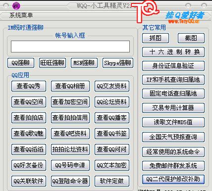 既时聊天 群发 QQ基本资料查看 QQ文本防盗加密(自己的密码加密,有工具不知道密码也解不了密-由于本人电脑被洗东西所剩无几无赖自创的) QQ登陆用bat文本处理(看什么木马能有这么牛-怎么记录密码和Q号) 其它功能自己体会 V2.0 增加破2带密码保护常用网地址 和常用油箱登陆